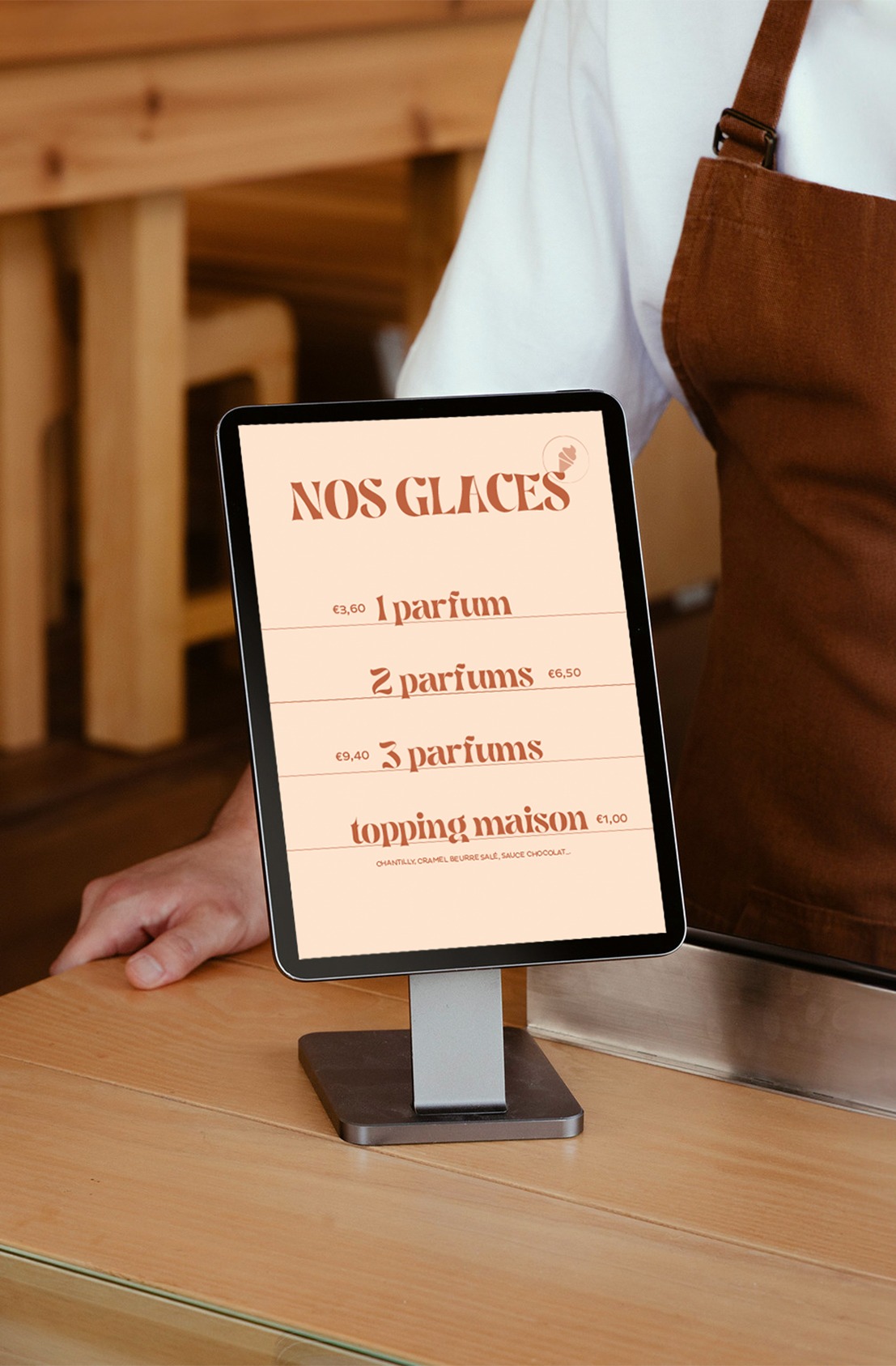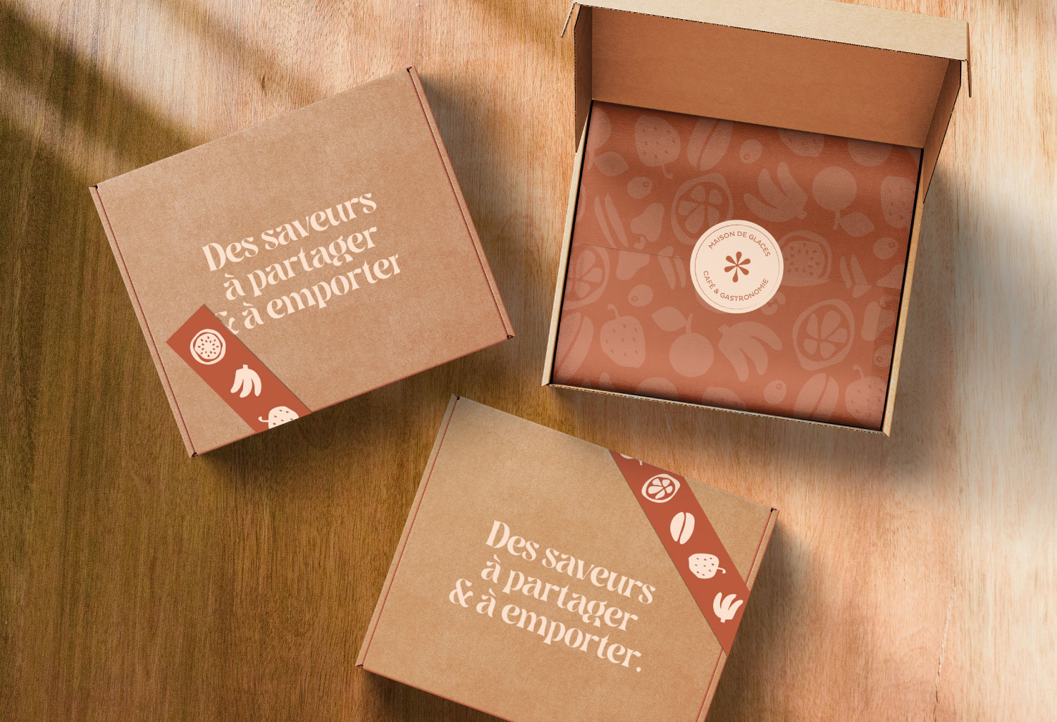 C’est cet esprit qui transparaît dans son identité visuelle : une typographie généreuse choisie pour son aspect creamy et gourmand, en écho direct aux textures des glaces artisanales. Un motif riche et vivant, inspiré de la diversité des saveurs. Une palette chromatique aux teintes chaleureuses reflétant l’accueil ensoleillé de la Martinique.
